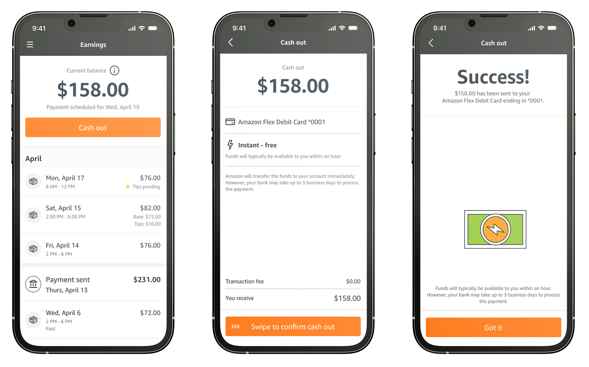 Your earnings are automatically added to your available Amazon Flex Cashout balance shortly after the end of your block time, while tip-eligible blocks are added 27 hours after block completion. If you want your earnings instantly, you can cash them out to your Amazon Flex Debit Card1 for instant access to funds at no cost, or to any other debit card for a 50-cent fee. If you’d prefer your earnings delivered to a bank account, you also have an option to cash them out to your bank account for same or next business day availability at no cost, or get your earnings to your bank faster for a 50-cent fee. You can use Amazon Flex Cashout at any time by going to Earnings > Cashout > Select your payment speed.