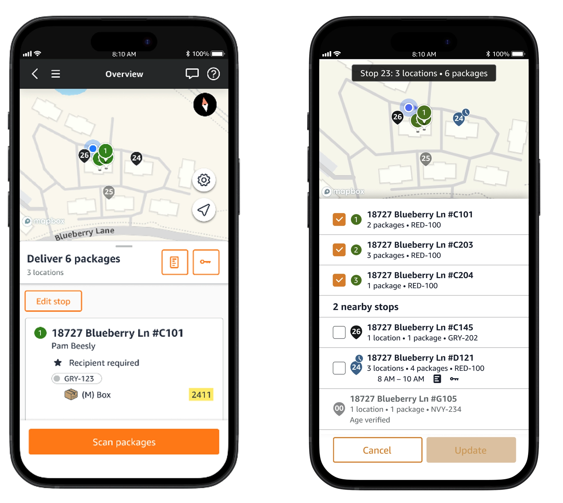 The interactive map displays nearby delivery locations, so you can easily see the proximity of each one to the others and decide if you’d like to group them differently to better suit your preferences. To adjust a stop, tap “Edit stop” and select the delivery location from the list that you’d like to change. Once adjusted, select “Update,” and your changes will be reflected in your itinerary. While you’re able to regroup stops and delivery locations, you’re still expected to deliver all packages assigned from your route.