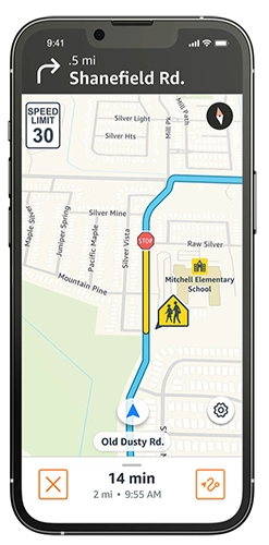 Amazon Flex maps and navigation are designed with your safety in mind. The Amazon Flex navigation system displays speed limits so you can continue to drive safely to and from delivery stations and stops. Remember to always stay alert to roadside speed limit signs and adjust your speed accordingly. Additional features in the Amazon Flex app include a map alert when you enter a school zone, and real-time icons when you are approaching an upcoming intersection. These can help you keep an eye out for pedestrians who may be crossing the road.