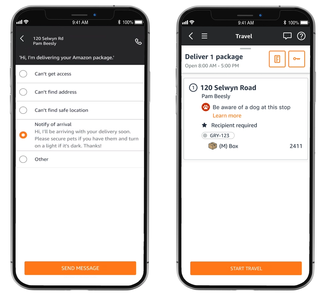 Once your delivery block begins, there are additional resources available to you in the Amazon Flex app. Using the “Notify of arrival” feature alerts the next customer on your route that you’re on your way, and asks them to secure any pets. To send this pre-written message, tap the question mark icon (?) > “Text the customer” > “Notify of arrival.” This feature is particularly important for delivery locations with a paw print icon next to the address in the app. The paw print icon means that a dog may be present, based on reports from the customer or delivery drivers who used the “Report a dog on your route” option. Each paw print also has a “Learn more” link with helpful dog safety advice that you can instantly view.
